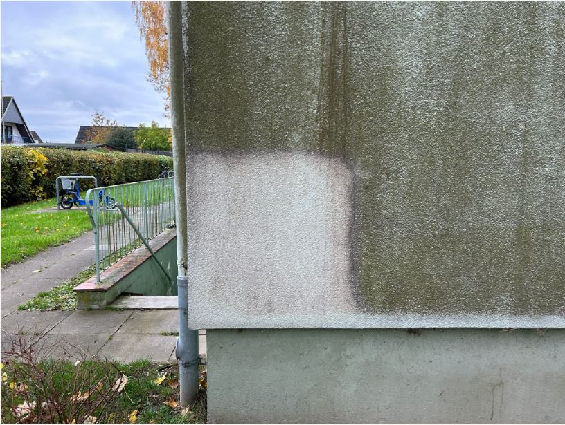 Der verzögerte Reinigungseffekt ist auf den natürlichen Abbauprozess von Algen, Flechten und Moosen zurückzuführen. Unser biologisch abbaubarer Desinfektionsreiniger wirkt schrittweise und nutzt die Witterungsverhältnisse, um die Verschmutzungen auf natürliche Weise zu zersetzen. Ein Abspülen der Fassade mit Wasser ist bei diesem Verfahren nicht erforderlich – die Reinigung erfolgt vollkommen selbstständig.